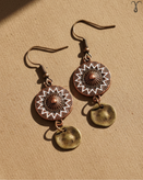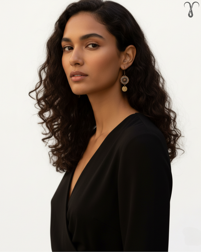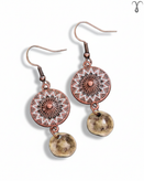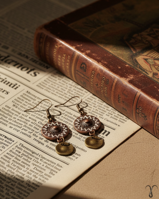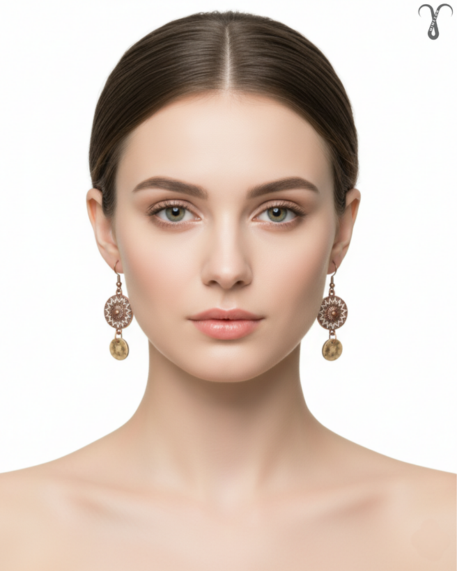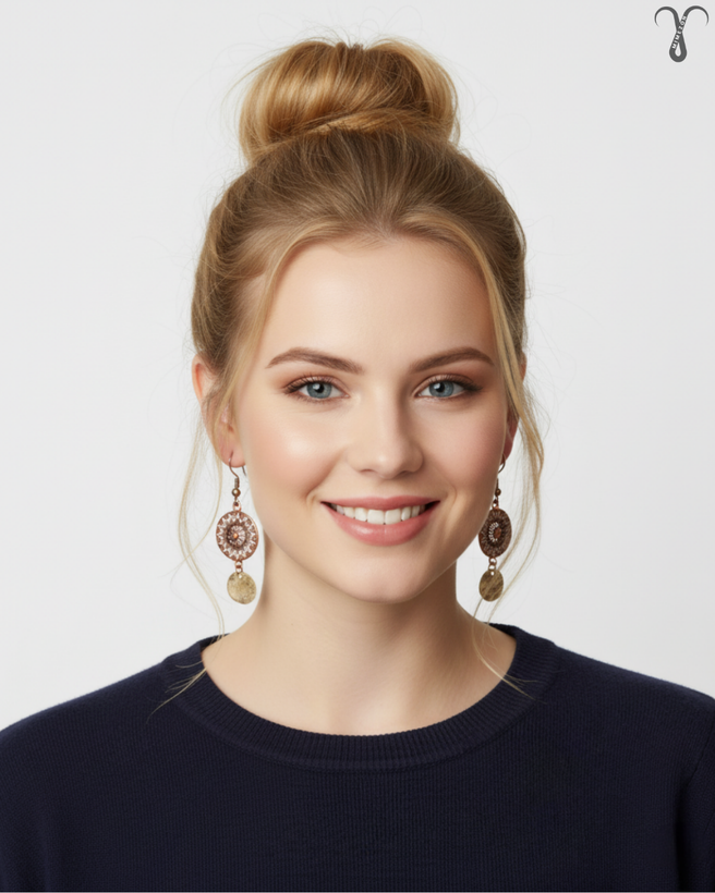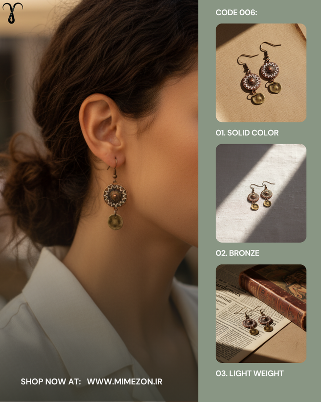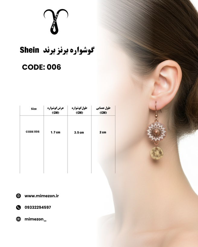▫️رنگ و ظاهر کلی گوشواره کد 006 از جنس برنز آنتیک کهنه است، این گونه طراحی معمولاً در سبک های بوهو و قومی دیده میشود. در آن از پرداخت با جزئیات سفید یا روشنتر در طرح گرد اصلی به صورت برجسته کار شده که نمایی خاص و شیک را تداعی میکند. این گوشواره تک نسخه و از برند Shein میباشد.