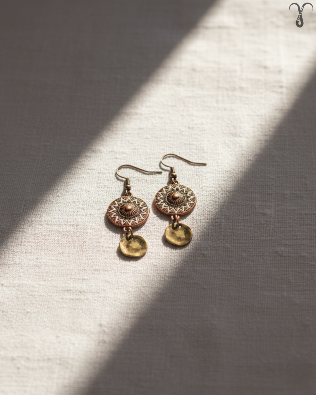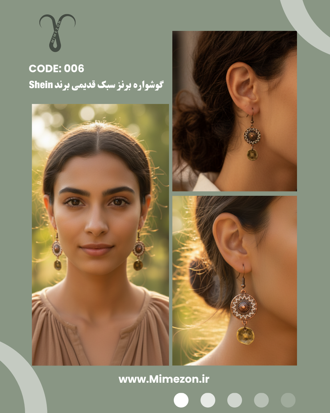 ▫️رنگ و ظاهر کلی گوشواره کد 006 از جنس برنز آنتیک کهنه است، این گونه طراحی معمولاً در سبک های بوهو و قومی دیده میشود. در آن از پرداخت با جزئیات سفید یا روشنتر در طرح گرد اصلی به صورت برجسته کار شده که نمایی خاص و شیک را تداعی میکند. این گوشواره تک نسخه و از برند Shein میباشد.